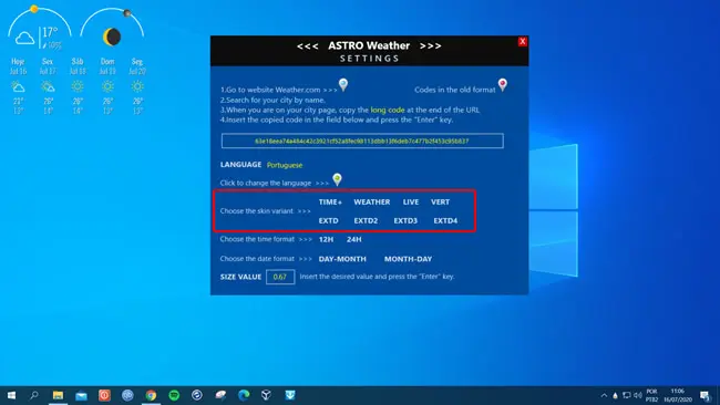 9. Na opção “Choose the skin variant”, você pode escolher entre diferentes variações do skin. Cada variação oferece uma disposição e informações diferentes. Por exemplo a variação extendida (Extd) exibe a previsão do tempo para os próximos 5 dias. Clique em cada uma das opções para visualizar.